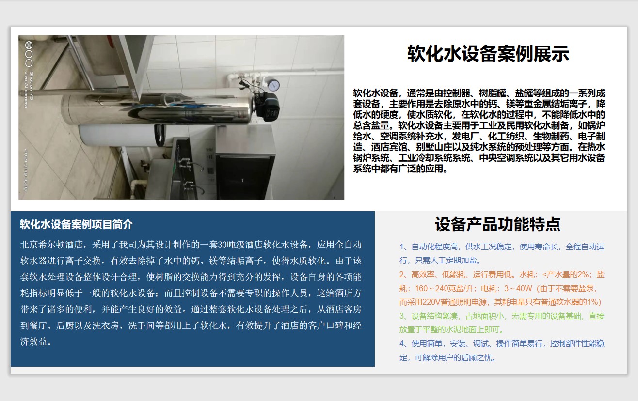 北京希尔顿酒店,采用了我司为其设计制作的一套30吨级酒店软化水设备,应用全自动软水器进行离子交换,有效去除掉了水中的钙、镁等结垢离子,使得水质软化。由于该套软水处理设备整体设计合理,使树脂的交换能力得到充分的发挥,设备自身的各项能耗指标明显低于一般的软化水设备;而且控制设备不需要专职的操作人员,这给酒店方带来了诸多的便利,并能产生良好的效益。通过整套软化水设备处理之后,从酒店客房到餐厅、后厨以及洗衣房、洗手间等都用上了软化水,有效提升了酒店的客户口碑和经济效益。