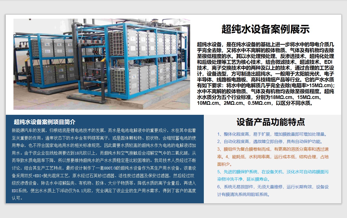 新能源汽车的发展,归根结底是锂电池技术的发展,而水是电池电解液中的重要成分,水在其中起着至关重要的作用。通常状态下的水中含有钙镁等离子,或是固体颗粒物、胶状物,会缩短蓄电池的使用寿命,也不符合国家电池用水的相关标准规范,因此需要水质较高的超纯水作为电池的电解液添加用水。由于该企业在线检测要达到18兆欧以上,而超纯水和空气接触后会溶解空气中的二氧化碳,从而导致水质电阻率下降,所以想要维持超纯水的产水水质稳定是比较困难的。我司技术人员经过不断讨论,结合其生产工艺特点,最终设计制作了一套800T/H的超纯水设备作为其生产用水设备。该套设备采用双反+EDI+抛光混床工艺,原水经过石英砂过滤器、活性炭过滤器及保安过滤器,然后经过双级反渗透设备,除去水中溶解盐类、有机物、胶体、大分子物质等。降低水质的离子含量后,再进入EDI系统,使出水水质上下浮动仅为0.1兆欧,完全满足了该企业的生产用水需求,得到了客户的高度认可。