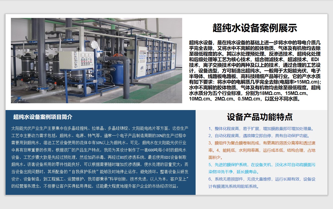 太阳能光伏产业生产主要集中在多晶硅提纯、拉单晶、多晶硅铸锭、太阳能电池片等方面,这些生产工艺中主要动力需求包括:超纯水、电源、特气等。通常一个电子产品制造周期的20%的生产过程中需要用到超纯水,湿法工艺设备使用的流体中有50%以上为超纯水。可见,超纯水在太阳能光伏行业中具有非常重要的作用。根据该厂的产品生产特点,我司为其设计制作了一套600吨每小时的超纯水设备,工艺步骤大致是先经过预处理,然后加药杀毒,再经过RO反渗透系统,最后使用EDI设备制取超纯水。该套设备所用的零件性能良好,可以根据需要随时增加反渗透膜,使水处理的容量变大;而当设备出现问题时,其所配备的“自我保护系统”能够及时地停止运作,避免损坏。整套设备从研发设计、设备制造,到工程施工、运营维护,我司都秉承"科学创新,技术先进,以人为本,客户至上"的经营服务理念,不但要让客户买得起用得起,还能最大程度地提升客户企业的市场经济效益。
