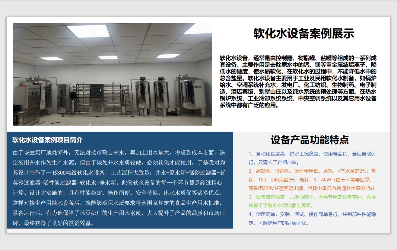 由于该豆奶厂地处郊外,无法对接市政自来水,再加上用水量大,考虑到成本方面,决定采用井水作为生产水源。但由于该处井水水质较硬,必须软化才能使用,于是我司为其设计制作了一套60吨级软化水设备,工艺流程大致是:井水-原水箱-锰砂过滤器-石英砂过滤器-活性炭过滤器-软化水-净水箱。此套软水设备的每一个环节都是经过精心计算、设计才实施的,具有性能稳定、操作简便、安全节能、出水水质优等诸多优点,这样对接生产用纯水设备后,就能够确保水质要求符合国家规定的食品生产用水标准。设备运行后,有力地保障了该豆奶厂的生产用水水质,大大提升了产品的品质和市场口碑,最终获得了良好的投资效益。