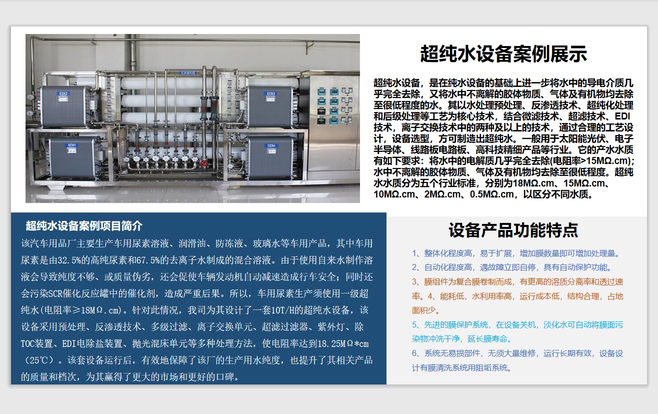 该汽车用品厂主要生产车用尿素溶液、润滑油、防冻液、玻璃水等车用产品,其中车用尿素是由32.5%的高纯尿素和67.5%的去离子水制成的混合溶液。由于使用自来水制作溶液会导致纯度不够、或质量伪劣,还会促使车辆发动机自动减速造成行车安全;同时还会污染SCR催化反应罐中的催化剂,造成严重后果。所以,车用尿素生产须使用一级超纯水(电阻率≥18MΩ.cm)。针对此情况,我司为其设计了一套10T/H的超纯水设备,该设备采用预处理、反渗透技术、多级过滤、离子交换单元、超滤过滤器、紫外灯、除TOC装置、EDI电除盐装置、抛光混床单元等多种处理方法,使电阻率达到18.25MΩ*cm(25℃)。该套设备运行后,有效地保障了该厂的生产用水纯度,也提升了其相关产品的质量和档次,为其赢得了更大的市场和更好的口碑。